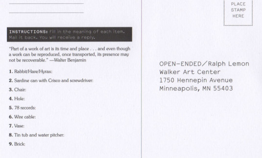 - Middle: Walker resident artist Ralph Lemon’s Mail-In Activity postcard (front), 2006. Image courtesy Walker Art Center.